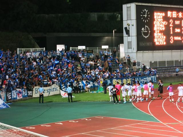 どちらにとっても負けられない大きな背景がある一戦だったが、前半は一方的な町田のペースとなる。まずは15分、町田の右CKからゴール前の深津が競り合ったボールを中島が頭で押し込み、1点を先制。前線で待つ三島に対してボールを供給したい水戸だが、そんな水戸の狙いを悟ってのことか、セカンドボールを徹底的に拾ってカウンターへと繋げていく。36分にはPA内に侵入した中島のクロスを中村がダイレクトで流し込んで2-0として折り返し。後半開始直後の49分には左CKをヨンアピンが決めて町田加入後初得点を挙げ、悠々と3点をリードする。ここまで水戸には試合の流れを引き寄せるだけの材料に乏しく、試合の行方はほぼ決したように思われた。しかし、前半に全く見せ場を作れなかった水戸は、HTに中盤の2枚替えを敢行。左サイドに湯澤を配し、徹底的にサイドを突いていく。町田にとって喫緊の課題でもある後半の息切れに対し、後半はじわじわと水戸が迫っていく構図となった。56分、水戸はゴール前の混戦からHTに投入された佐藤和弘が決めて3-1とすると、70分には左SBに佐藤和樹を投入し、湯澤とのコンビで一気に圧力をかける。78分には左CKを福井が合わせて決め、3-2の1点差。町田は選手を代えながら何とか押し返そうと試みるが、守備の出足が徐々に遅くなる中、縦横に揺さぶられて中央にもスペースが生まれるようになる。そして後半AT目前の90分、左サイドを起点に間延びした中央へ入ってきたボールに対し、フリーの佐藤和弘が受けてPA外から右足を一閃。強烈なシュートがゴール右隅に突き刺さり、土壇場で水戸が3-3とスコアをイーブンに戻した。前半と後半とで真逆の試合展開となった激戦はドロー決着。試合後、スタンドに歩み寄ってゴール裏へ別れの挨拶をした三島に対し、水戸サポーターからは激励の声が上がっていた。