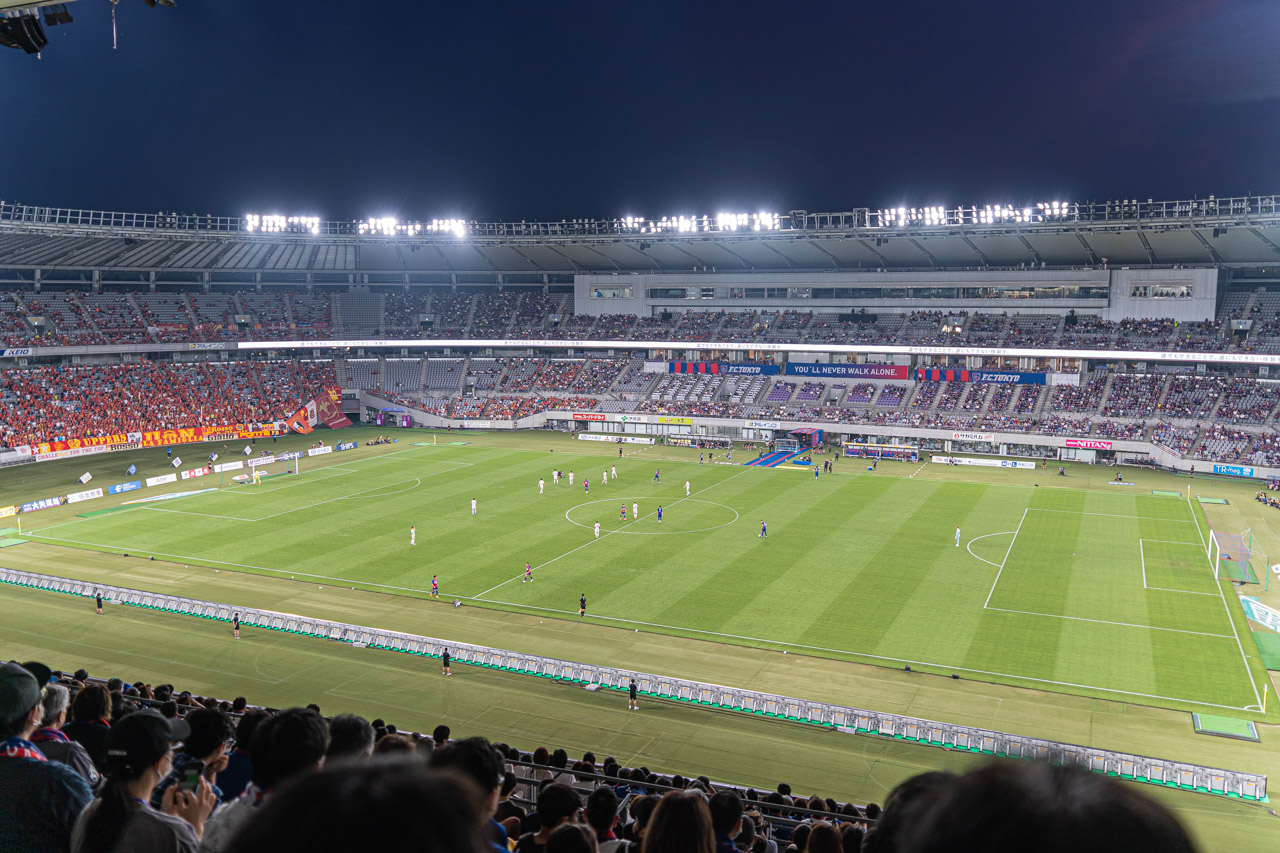 - 気温が上がってくる夏場を前に、今節からは週末でもナイトゲームでの日程が組まれている。今日の昼間も30℃に迫る気温となり、高い湿度も相まってかなり蒸し暑かった。飛田給に着いた時点では多少涼しくなってきてはいたが、選手にとってはやりづらいコンディションの時期がやってきたなという感じがする。観客にとっては気軽な服装で観戦できる時期ということもあってか、味スタには28,636人が来場。特に小学校の低学年程度とおぼしき子供たちが多く来場しており、トイレの列整理が全然できておらずちょっとしたカオスになっていたのが印象的だった(笑)。